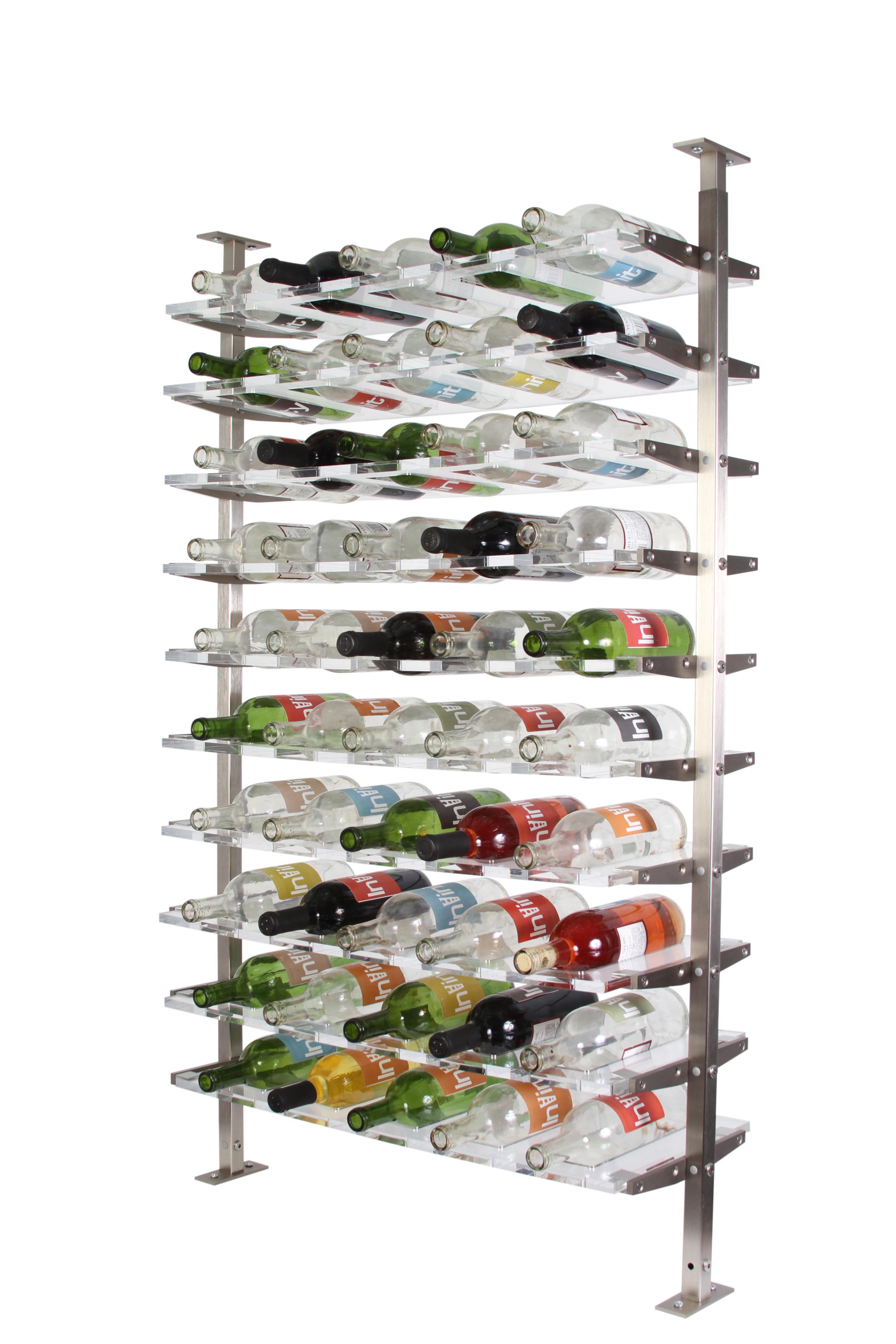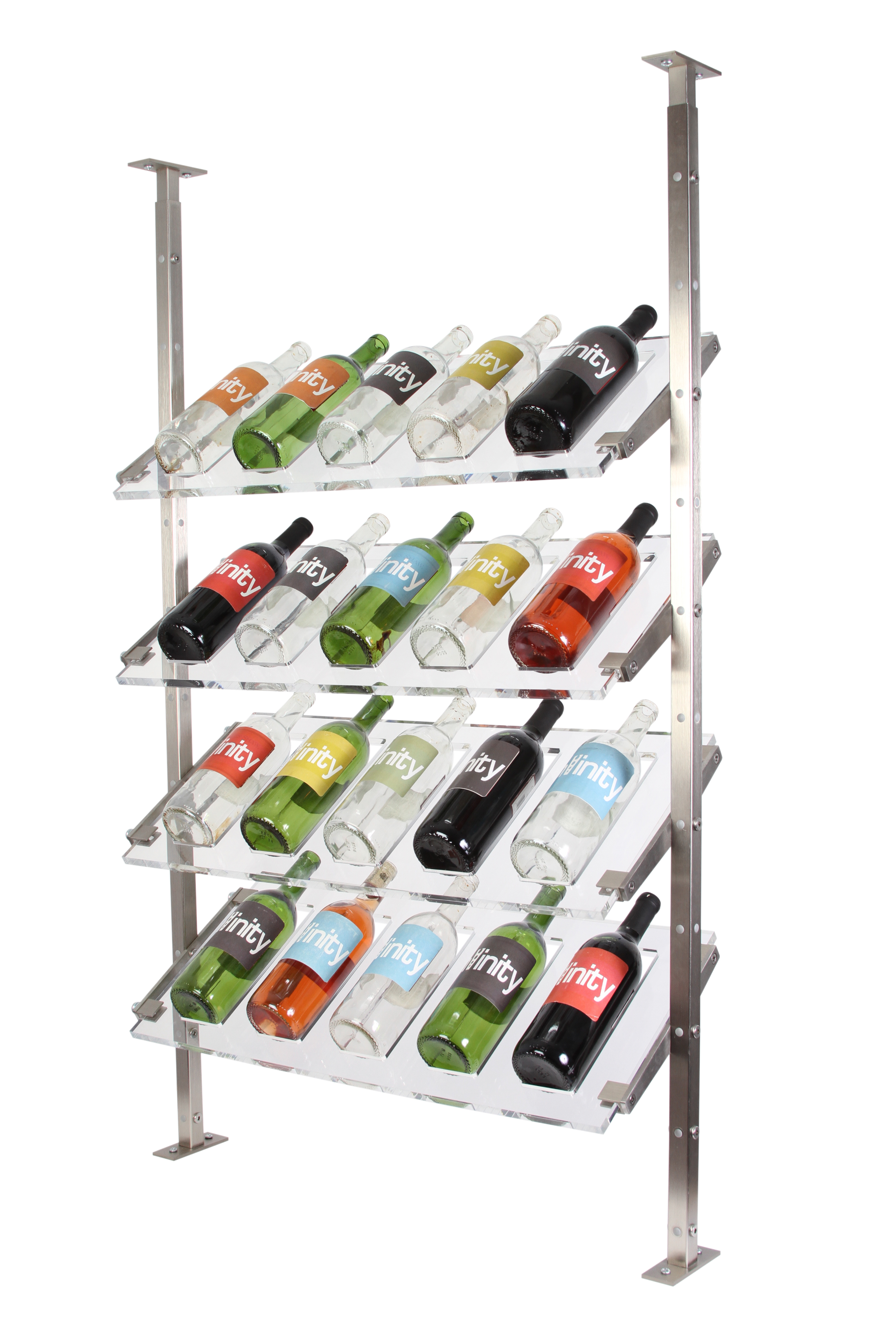 Distinct is a crystal clear acrylic wine shelving system that creates bring open spaces and allows the focus to remain on your wine collection. This line can be customized to 4 or 5 bottle shelves, angled and combinations.